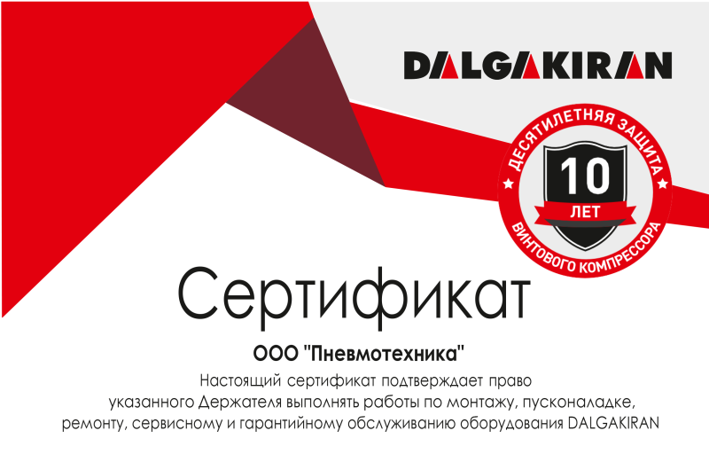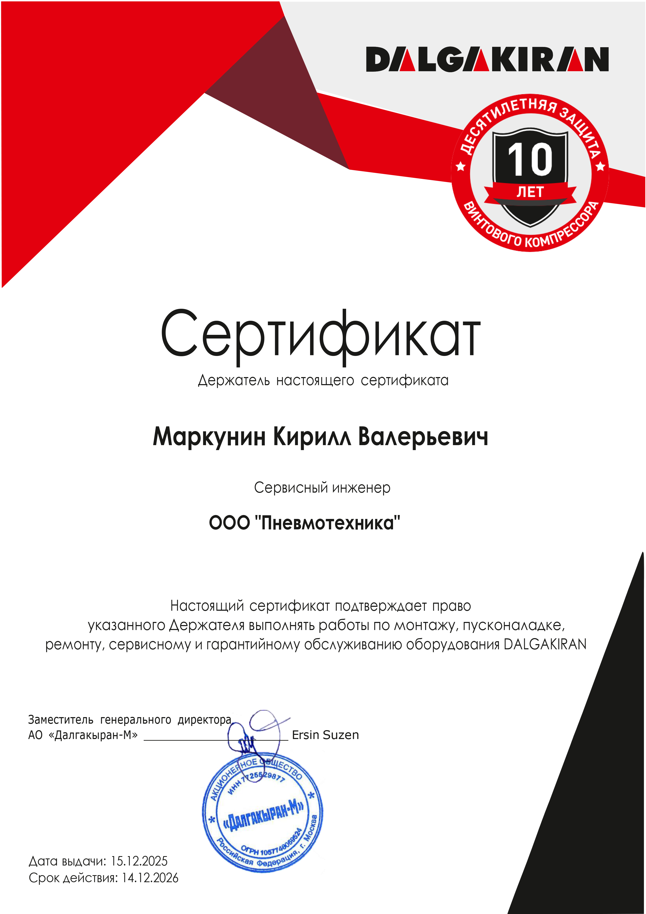 Сертификаты подтверждают право наших сотрудников выполнять полный комплекс работ по обслуживанию, ремонту и сопровождению компрессорного и промышленного оборудования бренда Dalgakiran, включая: